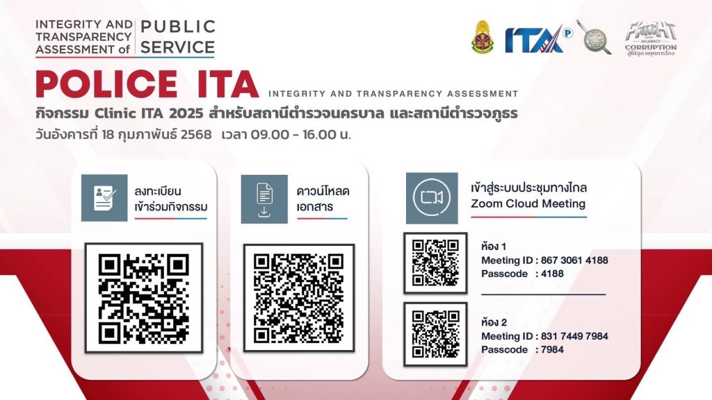 กิจกรรม Clinic ITA 2025 จัดขึ้นผ่านระบบ Zoom Cloud Meeting ตั้งแต่เวลา 09.00 – 16.00 น. โดยมีเจ้าหน้าที่จากสำนักงานตรวจสอบภายในและคณะกรรมการตรวจสอบ ITA ร่วมให้คำแนะนำเพื่อให้หน่วยงานตำรวจสามารถนำไปปรับใช้ได้อย่างมีประสิทธิภาพ